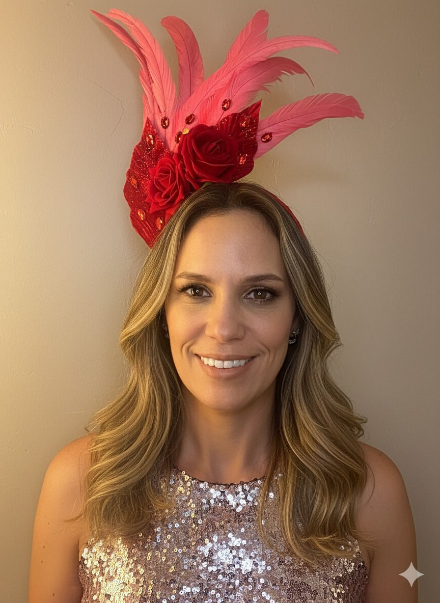 Tiara luxuosa com base de folhas douradas entrelaçadas, adornada com penas em degradê de verde e aplicações de pedras facetadas esmeralda. Um acessório imponente que une a sofisticação do ouro com a exuberância da natureza, ideal para eventos exclusivos e figurinos de luxo.